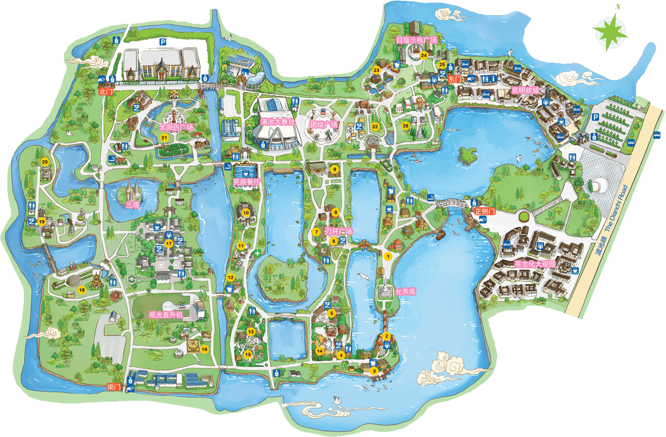 佤族人口約36萬,主要聚居在云南省瀾滄江南段以西的阿佤山區。佤族寨位于“翠漪洲”東南角。寨內分布有茅草頂的干欄式建筑群、牛頭廣場、神靈廣場、司崗里石雕以及糧倉等。牛頭廣場是佤族古老的剽?;顒訄鏊瑘稣械呐=菫樨糇宓恼瘶?,廣場前的兩個石人分別為佤族的男性和女性祖先。神靈廣場表現了佤族萬物有靈、靈魂不死的自然崇拜觀念。場中兩個石人雕像分別為佤族最崇拜的“木依吉”和“阿依娥”。佤族木鼓舞節拍鮮明強烈,...